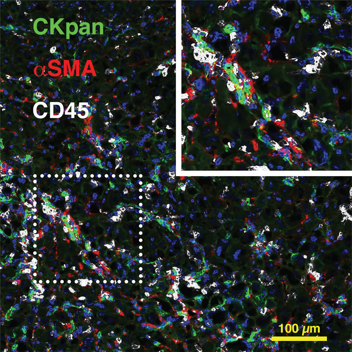 Figure 1 The injury and regeneration niche during chronic liver injury. Murine chronic liver injury induced by feeding a choline-deficient, ethionine-supplemented diet 15 leads to formation of an injury and regeneration niche, involving CKpan+ ductular cells and LPCs (green), αSMA+ hepatic stellate cells (red) and CD45+ inflammatory cells (white). DAPI was used for nuclear localisation.