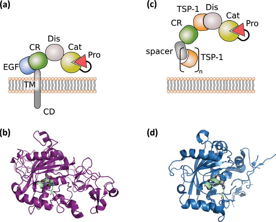 Figure 1. General structure of ADAM and ADAMTS proteases. (a) General domain structure of ADAM proteases. (b) X-ray structure (6BE6.pdb) of ADAM10, including catalytic, disintegrin and cysteine-rich domains. The catalytic zinc is highlighted in grey and the zinc-binding motif in pale green. (c) General domain structure of ADAMTS proteases. (d) X-ray structure of ADAMTS1 (2V4B.pdb), including catalytic and disintegrin domain. The catalytic zinc is highlighted in grey and the zinc-binding motif in pale green.