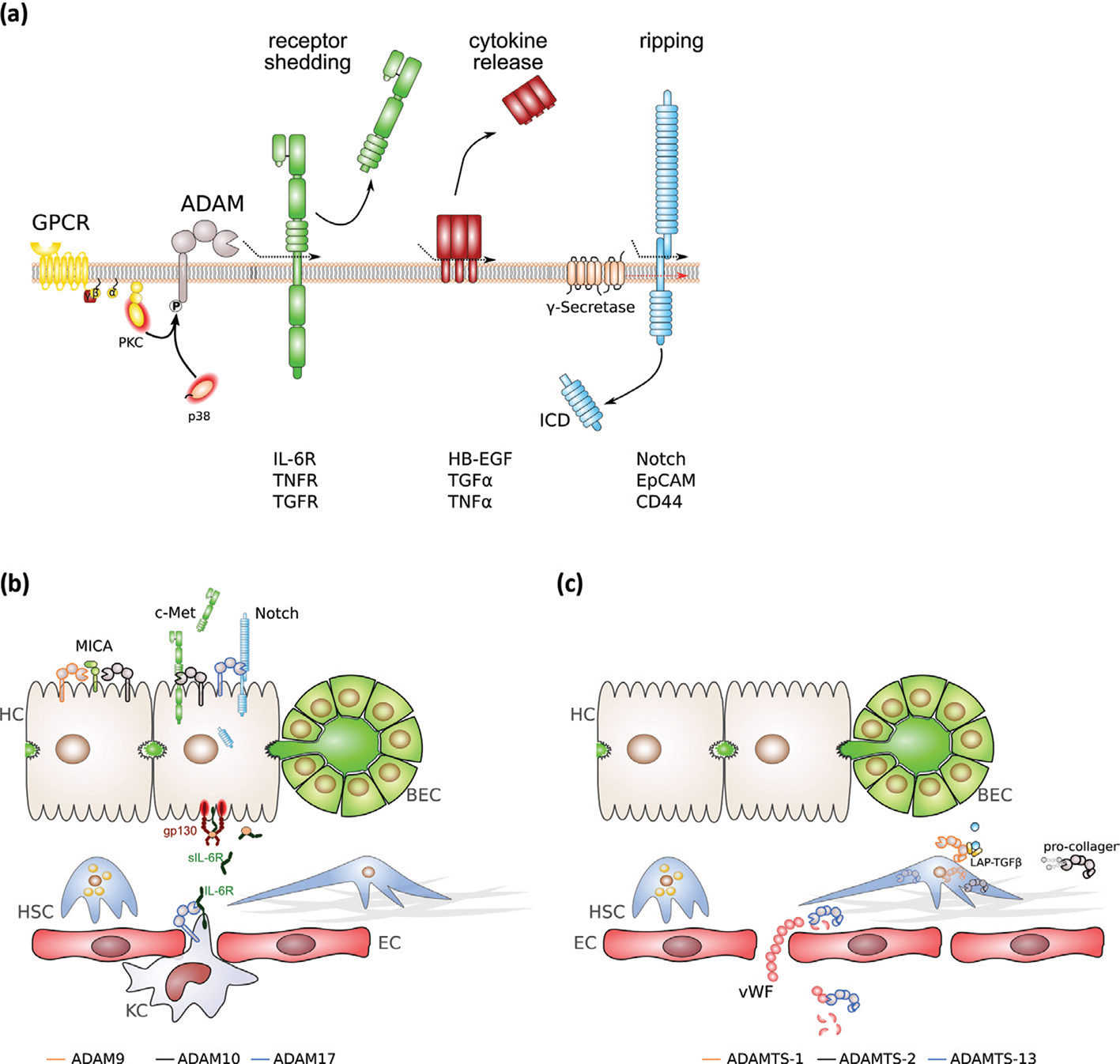 ADAM, a disintegrin and metalloprotease; ADAMTS; the ADAMs containing thrombospondin motif; ECM, extracellular matrix; HCC, hepatocellular carcinoma; MIC-A, major histocompatibility class I-related chain A; HSC, hepatic stellate cell; HPC, hepatic progenitor cell; L1CAM, L1 cell adhesion molecule; IL-6R, interleukin 6 receptor; EGFR, epidermal growth factor receptor; LAP-TGFβ, latency-associated peptide-transforming growth factor β; SAH, severe alcoholic hepatitis; ALI, acute liver injury; ALF, acute liver failure; vWF, von Willebrand Factor.