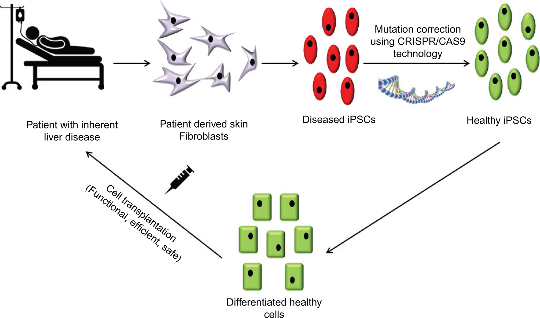 A major indication for liver transplantation is inherent metabolic liver diseases in children (53). iPSC technology provides a unique method for designing patient- and disease-specific therapies (54). Yusa et al. (55) showed that a combination of iPSCs and a transposon-based vector technology results in biallelic correction of a point mutation in α1-antitrypsin gene which is responsible for α1-antitrypsin deficiency. Additionally, genetic correction of iPSCs in patients with Wilson’s disease using a lenti-viral vector could reverse the functional genetic defect of Wilson’s disease gene in vitro (56). In principle, genetic correction of patient-derived cells is plausible in inherent liver diseases with known mutations (Figure 3) (57).