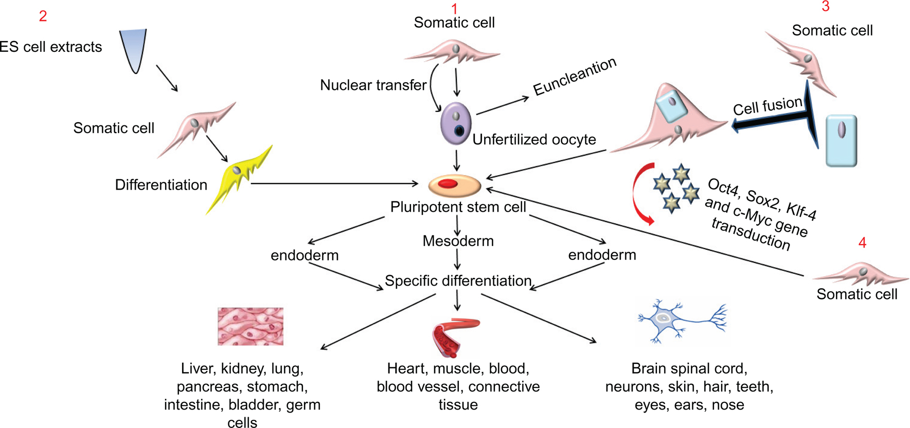 Figure 1. Approaches for creating reprogrammed cells from somatic cells. 1: Somatic cell nuclear transfer into oocyte; 2, adding embryonic stem cell (ES) extract to somatic cells; 3: somatic and ES cell fusion; and 4: transduction of pluripotency genes. Generated reprogrammed cells from each strategy can create three germ layers known as ectoderm, endoderm, and mesoderm. Induced redifferentiation of these reprogrammed cells can provide functional calls and tissues.